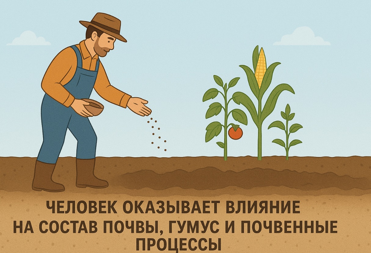 Человек, вследствие применения удобрений, агротехнологий, мелиорации, различных видов и сортов растений, оказывает значительное влияние на состав почвы, гумус и почвенные процессы
