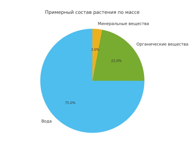 Таким образом, если рассматривать средний химический состав растений, то больше всего в них содержится именно вода, а из сухого вещества — органические соединения (углеводы, белки, липиды).