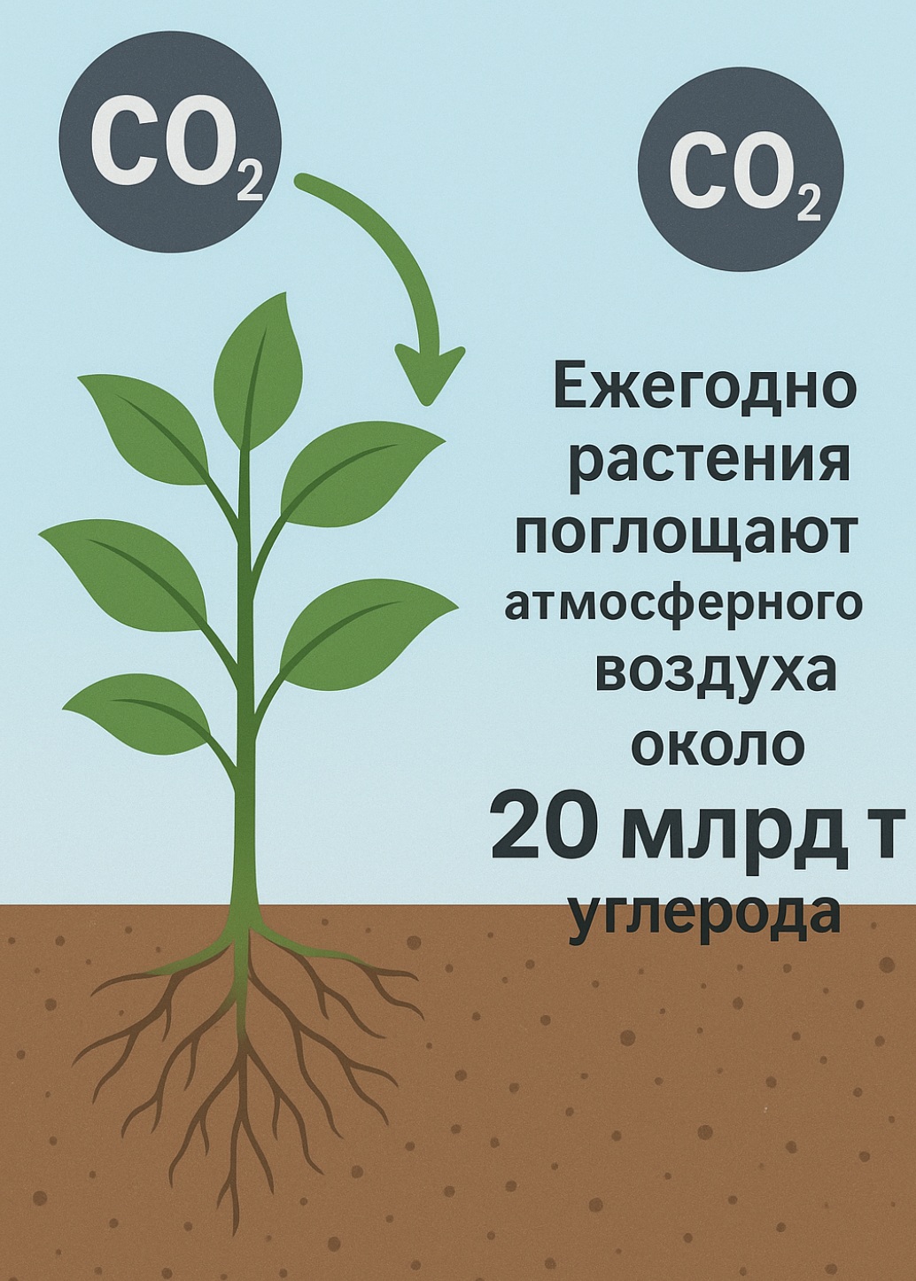 Основным питательным веществом для растений является углекислый газ CO2. Ежегодно растения поглощают из атмосферного воздуха около 20 млрд. т углерода! Растения очищают воздух и выделяют кислород, нужный нам для дыхания